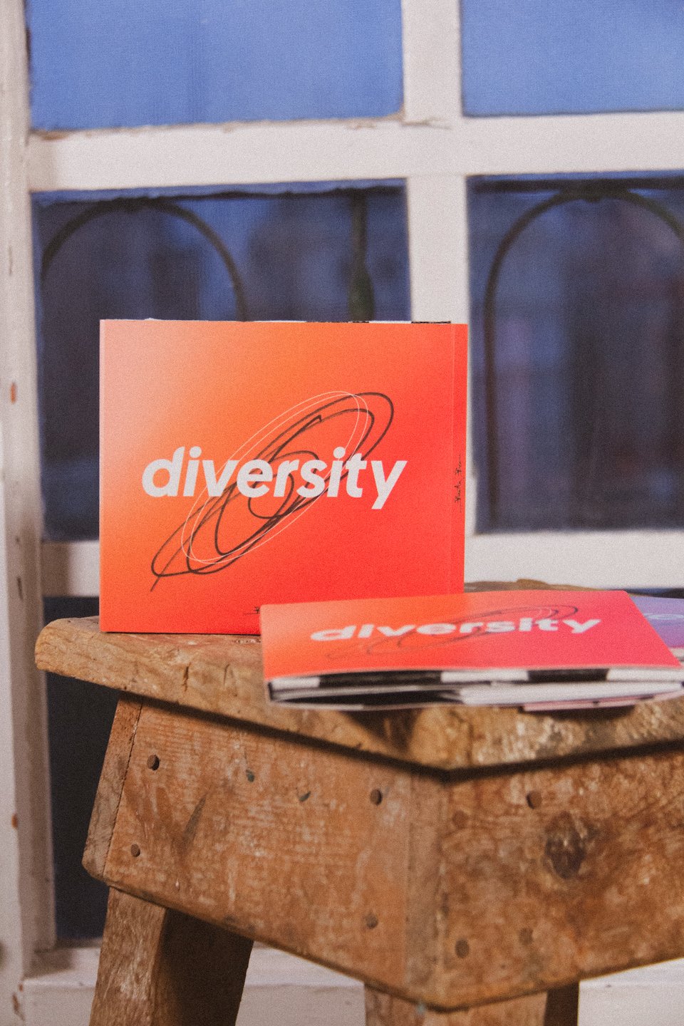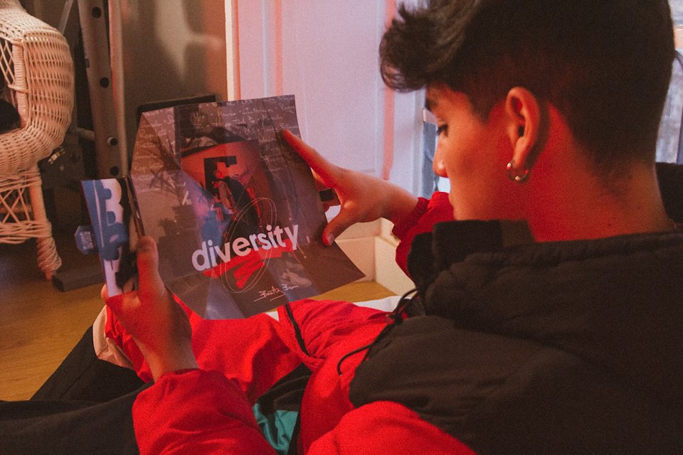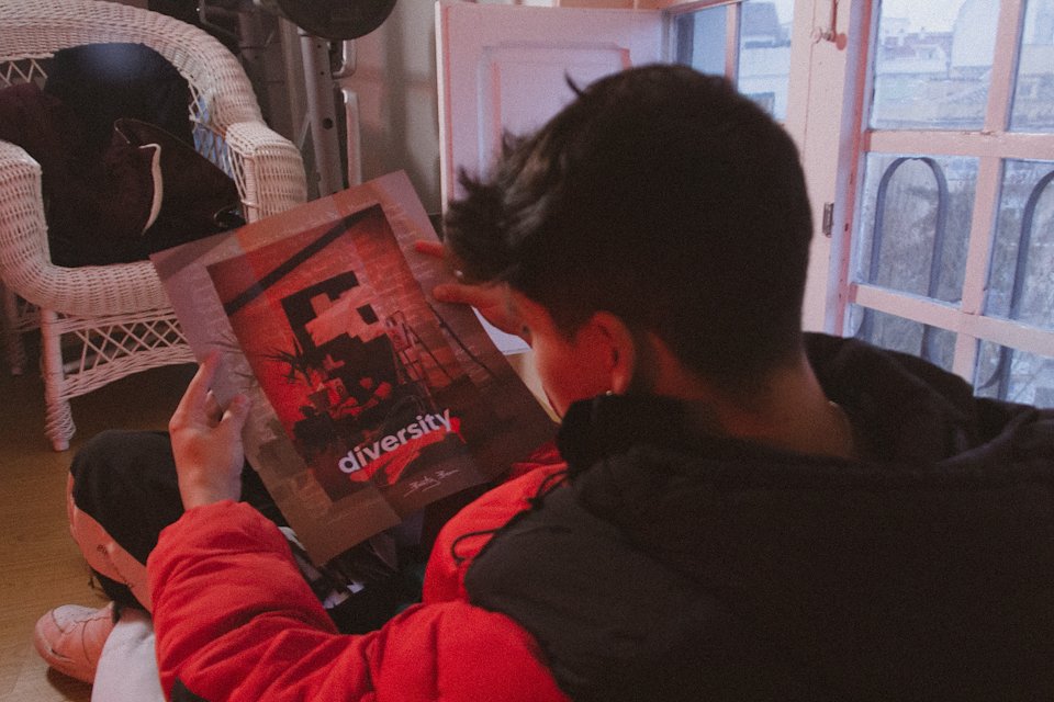 On one hand, the cover is simple and minimalist, inspired by Frank Ocean's "Blonde" album cover. It features only the word "Diversity" centered, surrounded by different strokes in the form of ovals, both digital and handwritten. These strokes allude to different realities and their coexistence.